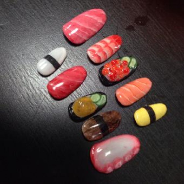 Nail art Sushi yang paling banyak populer dan menjadi bahan perbincangan di kalangan para netizen Jepang adalah hiasan berupa potongan Sashimi, telur Salmon, hingga gulungan telur (egg roll).
